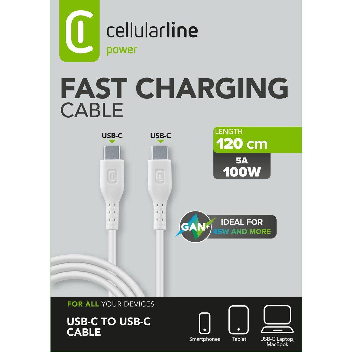Le câble 5A USB-C vers USB-C de 120 cm de Cellularline permet une charge jusqu’à 100W. Parfait pour un usage quotidien avec smartphones, tablettes et ordinateurs portables. Compatible avec les chargeurs GaN de 45W ou plus.