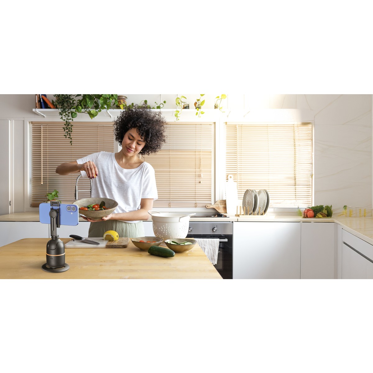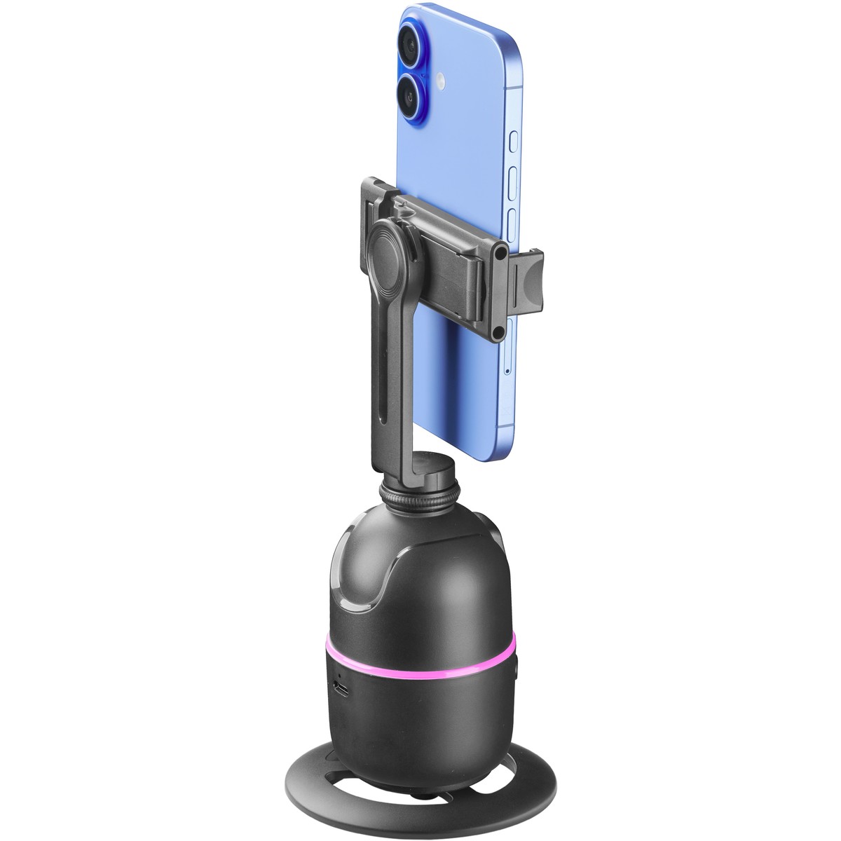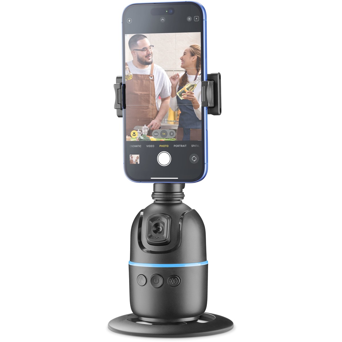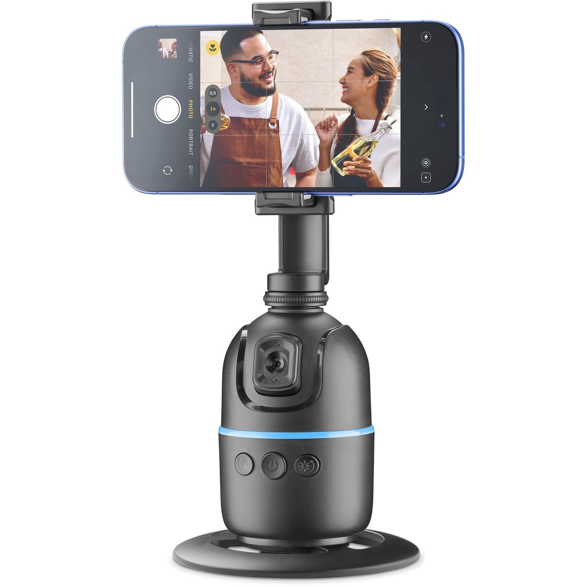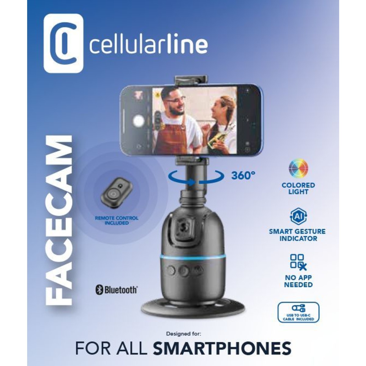 FACECAM is the advanced smartphone mount that enhances video recording and streaming with 360° facial recognition, ensuring a perfect frame at all times. It requires no app and includes a Bluetooth remote control for remote operation, along with gesture control technology, allowing you to start and stop recording with a simple hand movement. It supports 360° horizontal and vertical shooting with 180° front and rear angles and is height-adjustable for greater versatility. The top part is removable, transforming into a practical stand-alone smartphone holder. Compatible with tripods via a 1/4″ screw interface (tripod not included), FACECAM is the perfect choice for those seeking smooth recordings, convenience, and professional results.