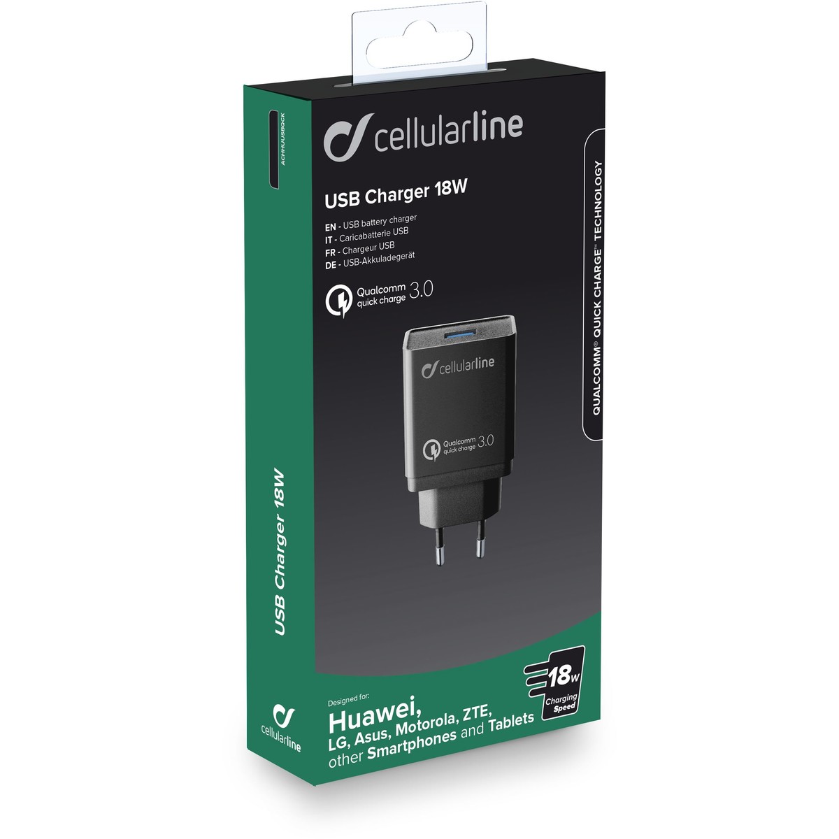 USB CHARGER 18W est le chargeur secteur idéal pour charger à la vitesse maximale et en toute sécurité les dispositifs Huawei et d’autres marques dotés de portUSB-C et compatibles avec la technologie Qualcomm® QuickCharge™. Qualcomm is a trademark of Qualcomm Incorporated, registered in the United States and other countries. Quick Charge is a trademark of Qualcomm Incorporated. Qualcomm Quick Charge is a product of Qualcomm Technologies, Inc. and/or its subsidiaries.