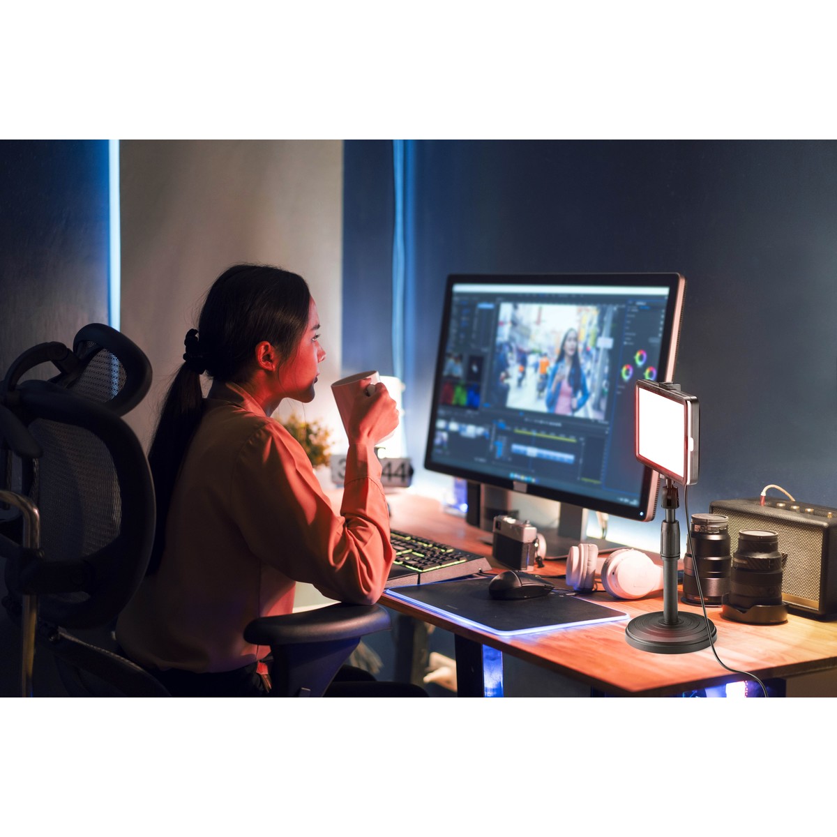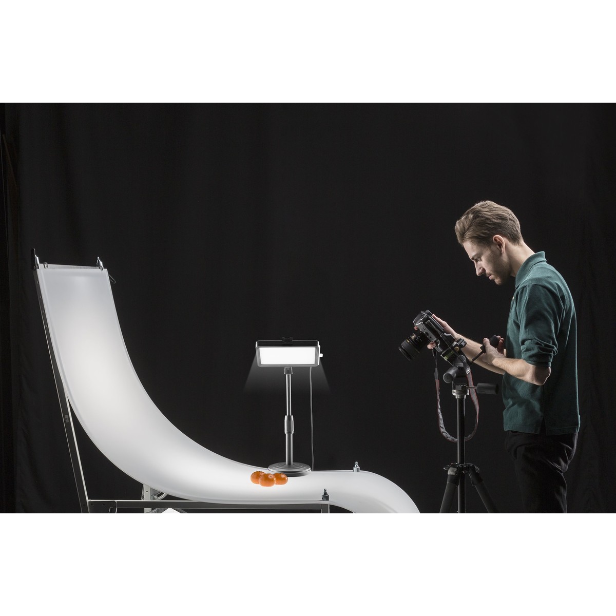 STUDIO LIGHT COLOR est un panneau lumineux composé de 120ampoules LED, idéal pour être utilisé comme jeu de lumière lors de tournages vidéo ou pour la photographie de produits.Le panneau LED dispose de trois modes d’éclairage (lumière blanche froide, lumière blanche chaude, lumière blanche naturelle) avec une intensité réglable. Il comporte également 4 filtres colorés (vert, rouge, jaune et bleu) pour créer des effets de lumière colorés. Le support est réglable en hauteur jusqu’à 31cm et est inclinable. Compact et pliable, il est idéal pour un transport pratique partout où vous le souhaitez.