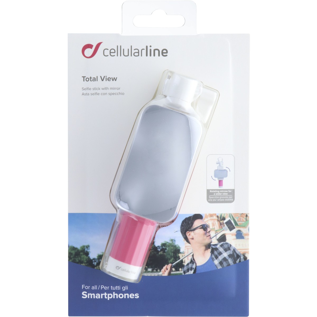 Total view est une perche à selfie dotée d’un miroir pivotant, parfaite pour ceux qui aiment faire des selfies de groupe. Grâce à son support articulé, Total View permet de positionner de différentes façons le smartphone et de faire différents types de selfies : le selfie classique (avec l’appareil photo frontal), le selfie en haute définition (avec l’appareil photo arrière) et le selfie-portrait (en positionnant le smartphone à la verticale). De plus, le miroir pivotant est utile pour avoir un angle de vue très large, idéal pour faire des photos de groupe.
