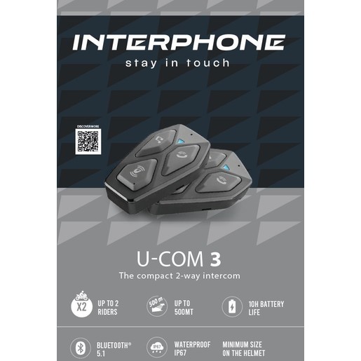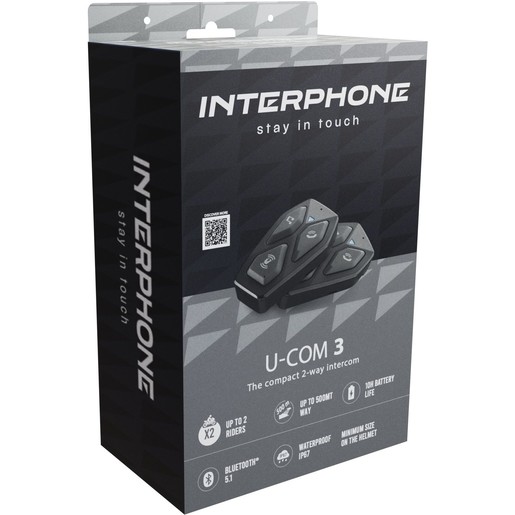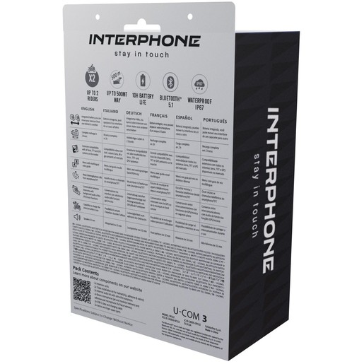 U-com 3 est l’intercom moto équipé de la technologie Bluetooth® 5.1, aux dimensions réduites et à batterie intégrée, entièrement compatible avec les systèmes OEM d’origine installés sur les casques et avec la plupart des intercoms d’autres marques disponibles sur le marché. Ce modèle vous permet de communiquer avec un passager ou une autre moto jusqu’à une distance maximale de 500 m. Équipé d’une nouvelle application multilingue très conviviale, l’expérience utilisateur est simple et intuitive, ce qui vous permet de maximiser le potentiel de l’intercom et d’offrir la meilleure personnalisation possible. U-com 3 est également équipé de haut-parleurs HD de 32 mm avec une qualité de basses élevée, pour écouter votre musique préférée, y compris en arrière-plan pendant une conversation.
