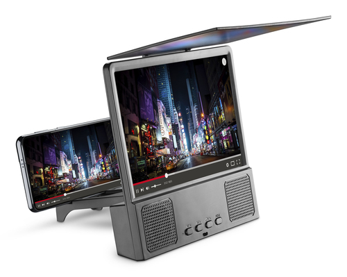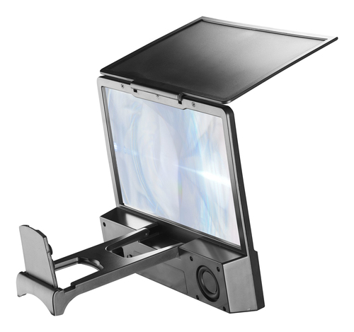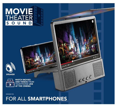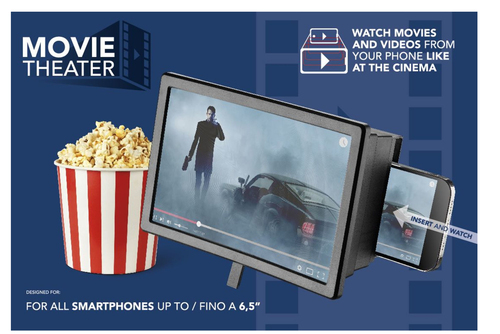 MOVIE THEATER ist ein Videoverstärker für Smartphones. Das beiliegende Stativ ermöglicht Ihnen die Erweiterung des Displays für ein optimales Erleben bei der Wiedergabe von Inhalten. Er ist kompakt, klappbar und ideal für den Transport.