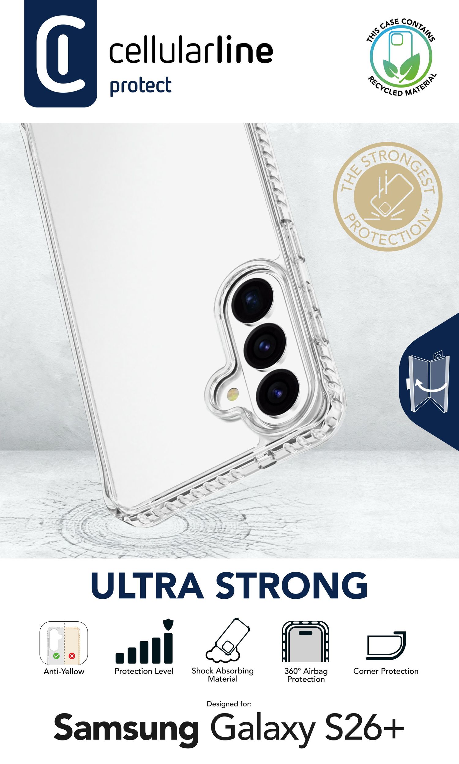 Ultra Strong ist die transparente Hülle für alle, die einen besonders hohen Schutz suchen. Durch die verstärkte Struktur mit stoßdämpfenden Rändern und integrierten Luftkammern entlang des gesamten Rahmens werden Stöße effektiv absorbiert und abgefedert. Die verwendeten Materialien sind gegen Vergilbung behandelt und enthalten eine antibakterielle Formel, die das Wachstum von Bakterien auf der Oberfläche hemmt. Erhöhte Ränder schützen Kamera und Display, während ein Teil der Hülle aus recyceltem Kunststoff besteht. Ultra Strong hat Falltests gemäß Military-Test-Standards bestanden und bestätigt damit ihre Zuverlässigkeit in jeder Situation.