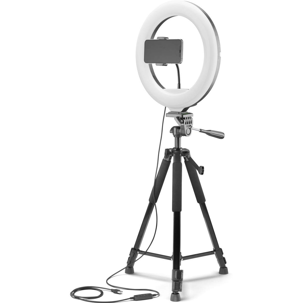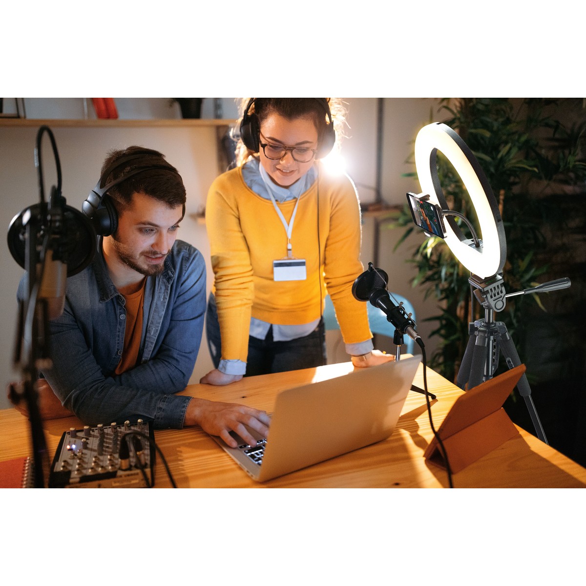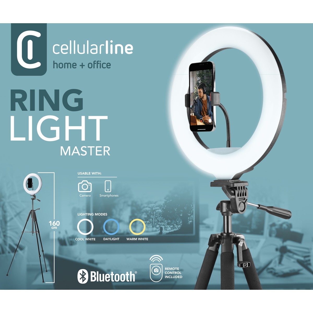 Ideal for shooting videos and selfies, RING LIGHT MASTER is a LED ring with a tripod that can be extended up to 1.40 meters in height. The 13” LED ring has three different lighting modes with an adjustable intensity and is equipped with a universal rotating support for smartphones and a camera mount. Thanks to the Bluetooth® remote control, included in the package, you can also take selfies or activate videos from a distance.