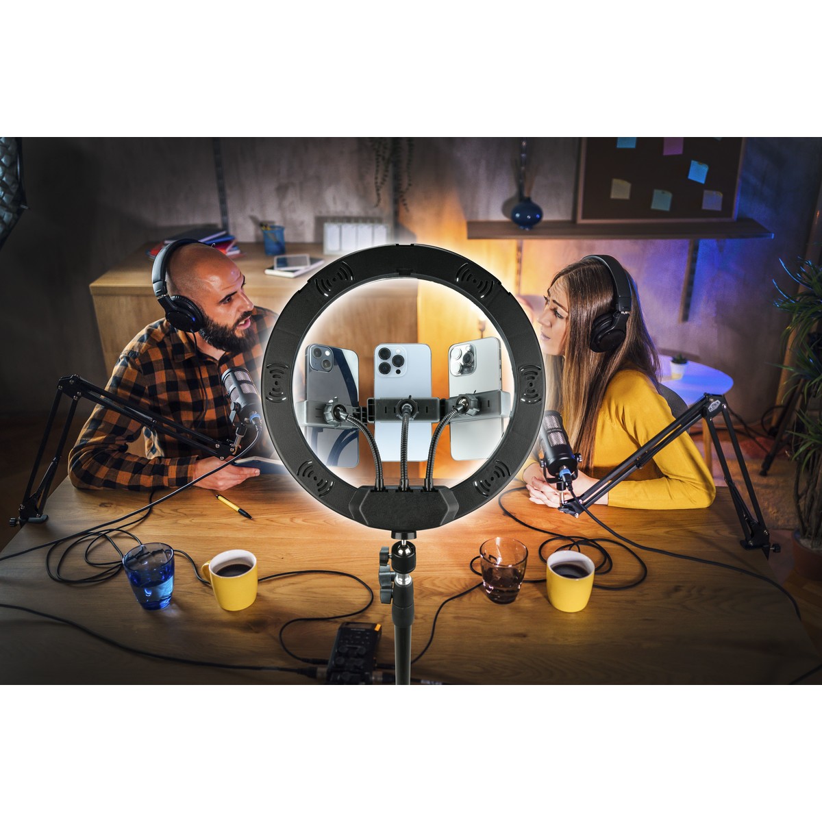 SELFIE RING TRIO: LED ring with tripod extendable up to 1.60m height ideal for video and selfie shooting. The 13” led ring has three lighting modes, with adjustable brightness, activated by remote control and is equipped with three universal phone holders. Thanks to the three phone holders, it is possible to activate simultaneous video filming in the company of friends and live on several social networks!