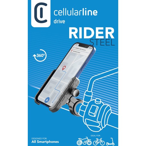 RIDER STEEL is the solid and resistant aluminium handlebar mount, compatible with all smartphones. Thanks to the adjustable clamp, it can be installed on handlebars of from 12 to 32 mm in diameter or on the side mirror using the special attachment included in the package. The quick on/off system allows easy interaction with the smartphone, even while driving.
