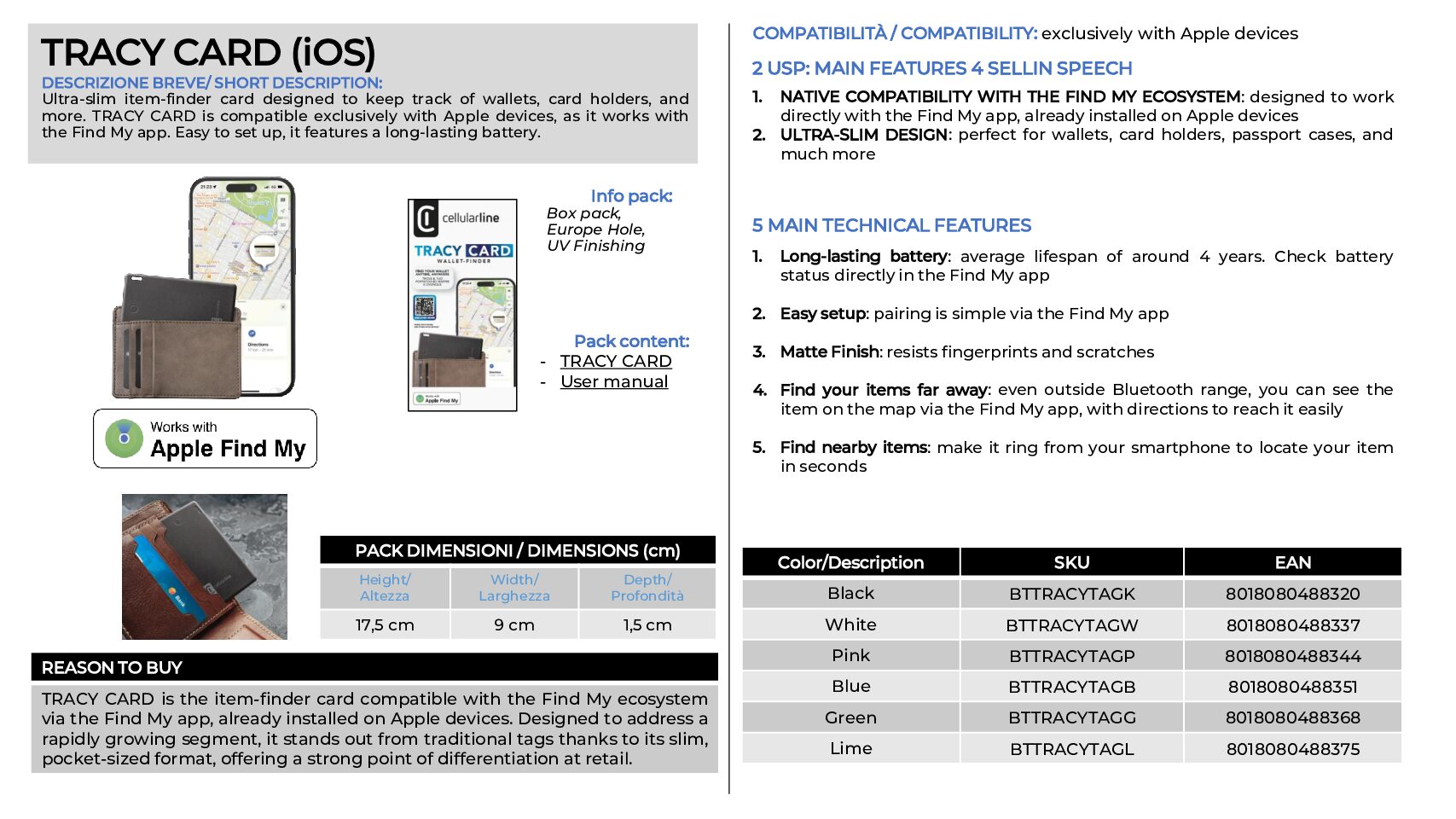 TRACY CARD è un dispositivo a forma di card progettato per tenere traccia dei tuoi oggetti personali. Estremamente sottile, può essere facilmente inserito in portafogli, portacarte e molto altro. Con TRACY CARD, rintracciare sia gli oggetti lontani che quelli vicini è facile e veloce. Questo dispositivo è compatibile esclusivamente con i dispositivi Apple, poiché utilizza l’app Find My, già installata sui dispositivi Apple, per monitorare la posizione recente dei tuoi oggetti. Dotato di una batteria di lunga durata, TRACY CARD è semplice da configurare grazie all’app Find My (iOS) per il pairing.