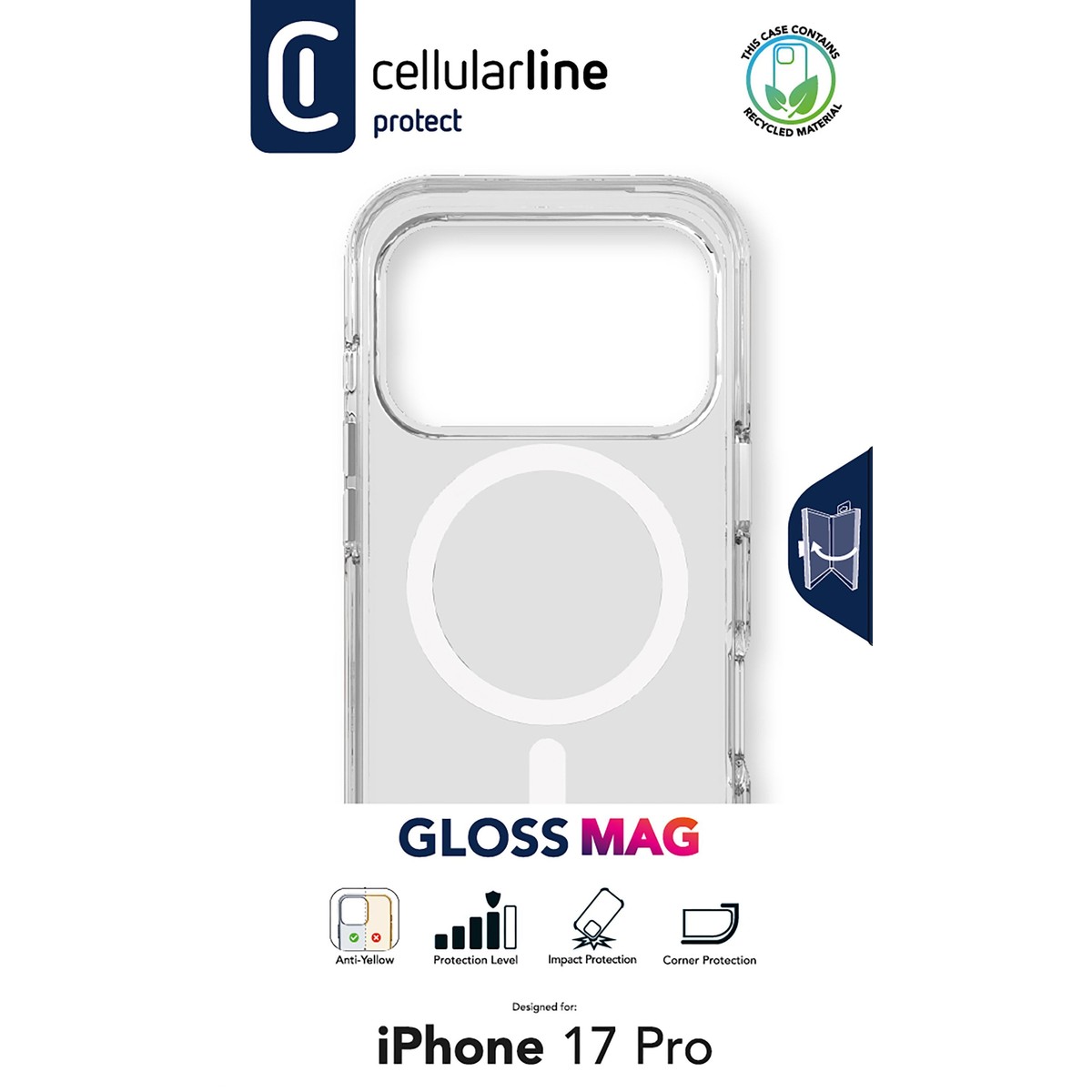 Gloss Mag è la custodia trasparente con magneti integrati che si allinea perfettamente allo smartphone consentendo la ricarica e l’aggancio all’alimentatore Apple MagSafe. Ultra resistente, con certificazione MilitaryTest, offre allo smartphone una protezione completa da urti e graffi mantenendone inalterato il design. Gloss Mag è garantita a vita: per saperne di più visita la sezione Guaranteed For Life di Cellularline.