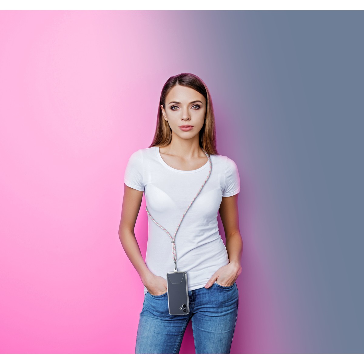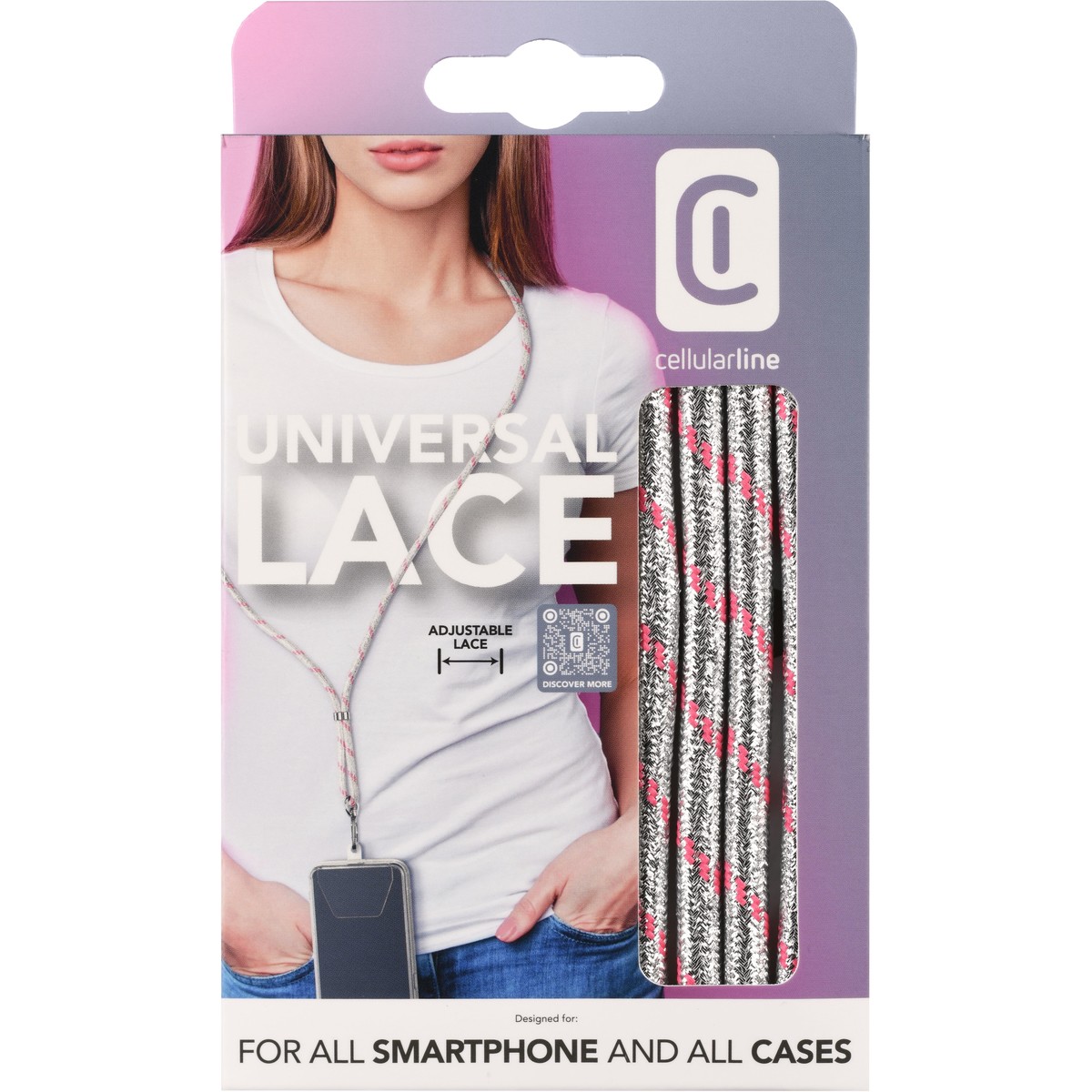 UNIVERSAL LACE è la soluzione universale per tutti gli smartphones e per tutte le tipologie di custodie, che consente di portare al collo o a tracolla il proprio smartphone e averlo sempre a portata di mano. Universal Lace si compone di un laccio in tessuto regolabile al quale è agganciata una linguetta in plastica trasparente da posizionare tra la custodia e lo smartphone. La linguetta adesiva può essere attaccata alla custodia o al retro del telefono e grazie alla colla epossidica si può staccare e riutilizzare più volte.