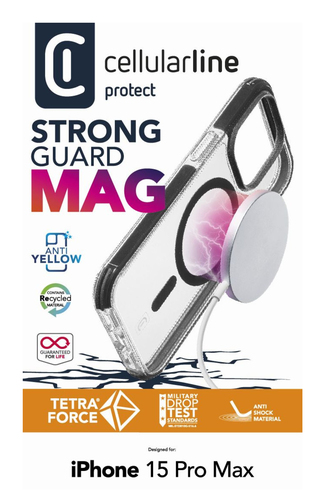 STRONG GUARD MAG est conçu pour interagir avec l’écosystème MagSafe d’Apple. Grâce aux aimants intégrés, l’étui s’aligne parfaitement sur le téléphone et permet de le charger et de l’arrimer avec le chargeur MagSafe.Elle est l’étui rigide ultra-protecteur avec bord relevé et coins renforcés, réalisé avec des matériaux technologiques de pointe capables d’atténuer et de dissiper les chocs en cas de chute. La technologie IDS (Impact Dissipating System)™, développée par Cellularline, utilise le matériau innovant Versaflex™ qui permet de dissiper l’énergie engendrée par le choc, évitant ainsi le risque de dommages extérieurs et intérieurs du smartphone. Il est réalisé avec une technologie antibactérienne Microban® qui élimine jusqu’à 99,9 % de la prolifération de bactéries sur la surface de l’étui et est constamment active car elle est intégrée dans le matériau de la Tetra Force Strong Guard.Tetra Force Strong Guard est garanti à vie : pour en savoir plus, consultez la section Guaranteed For Life de Cellularline